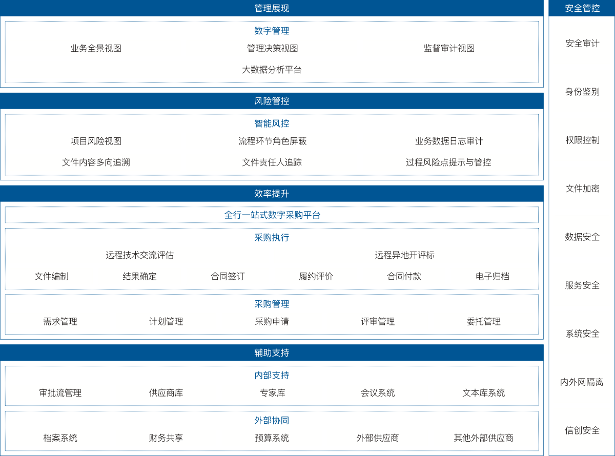 金融招采平台是公司结合众多金融行业采购特点,采用流程优化再造的理念,为银行、保险、证券、交易所、基金等金融机构打造的细分行业产品,助力金融行业采购合规管控、风险防范、成本管理和效率提升。系统由采购预算、采购需求、采购过程管理、合同管理、电子开评标、网上商城等构成,可实现金融行业采购需求与管控全过程、全流程的电子化,为采购需求方、采购执行人、投标人、专家、监管机构提供一个一体化的操作执行、监督管理与决策支持平台。